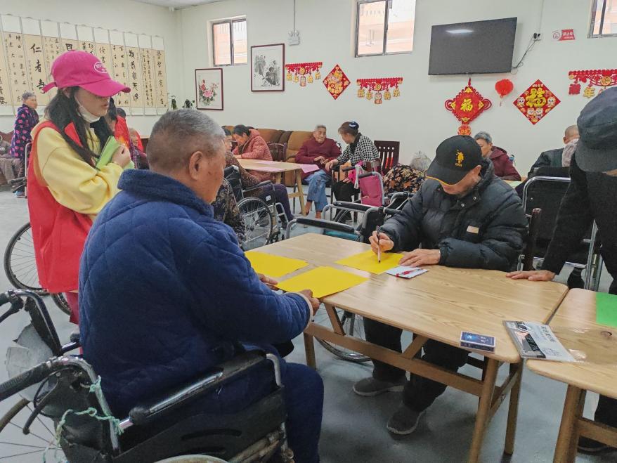 志愿者和老人们一起开展了手工折纸、纸牌游戏、书法展示和象棋对战等活动。活动过程中,老人们感到特别的开心。