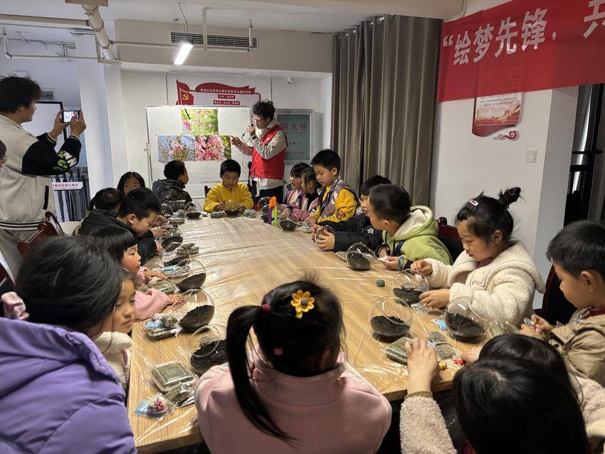 志愿者们准备了10多种多肉、蕨类植物,并一一为小朋友介绍了不同植物的种类、作用和种植方法。让小朋友们化身妙手花匠,挑选自己喜爱的多肉和摆件,手植新苗,自由DIY多肉微景观,并为自己的作品编写故事,有池塘里的小青蛙、放学的小女孩等一幅幅生动形象的作品。小朋友们成功将多肉植物种在了微景观玻璃瓶中,多肉宝宝在小朋友们灿烂的笑容中,也散发出了勃勃生机。