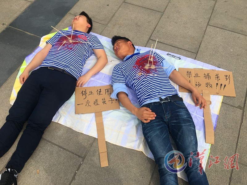 当天上午,有的学生头戴防毒面具,举着写有“怀念呼吸、怀念空气”的宣传牌,并现场出售瓶装“新鲜空气”;有的学生盘腿坐在一堆白色垃圾中,神情落寞地翻书,以此提醒人们抵制白色垃圾;有的学生把红色颜料涂在上衣上,在“血迹斑斑”的胸前竖起一根根木筷,用这种惊悚的方式倡导人们不使用一次性筷子和禁止捕杀野生动物。