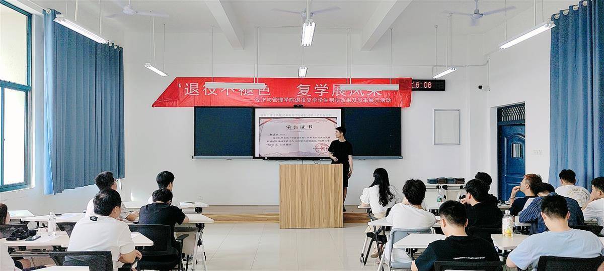 湖北日报讯(通讯员徐丹丹)退役不褪色,复学展风采。5月21日下午,湖北文理学院理工学院经济与管理学院教工党支部开展退役复学学生帮扶效果及风采展示活动,该院20组退役复学学生帮扶小组参与现场展示。