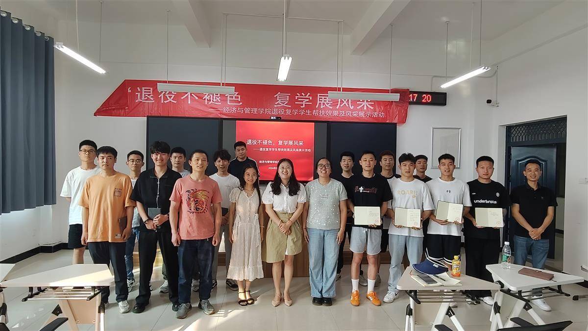 本次活动是经济与管理学院教工党支部“精准帮扶 携手共进”为主题的“一支部一特色”党建品牌建设的阶段性成果展示。在活动现场,20名退役复学学生从个人基本情况、军营风采、复学风采及未来职业规划等方面进行了展示。多名退役复学学生不仅在军营期间获得了多项荣誉,退役复学之后在帮扶教师的引导和帮扶下参加新生军训指导、学科竞赛、志愿服务、班级管理等,取得了优异的成绩。