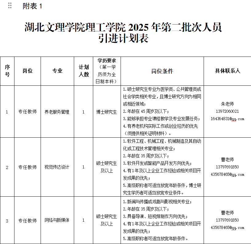 具备岗位所必需的其他条件,详见《湖北文理学院理工学院2025年第二批次人员引进计划表》(附表1)。