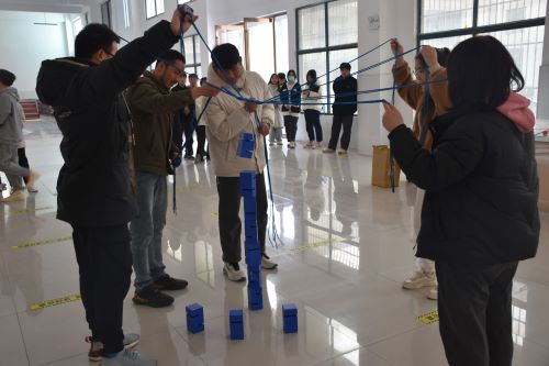 此次素质拓展包括“指压板”“箭在弦上”“旱地冰壶”“合力建塔”四个项目。在“合力建塔”比赛中,大家一起拉紧绳头来控制塔钩移动,用塔钩将一块块塔吊起,用时少的队伍获胜。游戏过程中,每队成员充分发挥团队协作精神,不惧挑战,出色地完成了每个项目。