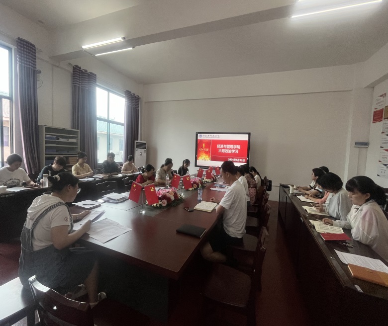 (经管学院 周晓桥)为落实政治理论学习制度,凝聚教职工团队向心力和凝聚力,提高教职工政治理论素养,6月13日下午,经济与管理学院在4教309会议室开展六月教职工政治理论学习,全体教职工参会。