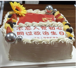 接下来,开展了学生党员过政治生日活动,不仅为学生党员送上了一封封“政治生日”贺卡,还为大家准备了政治生日蛋糕,学生支部所有同志一起不忘入党初心,同过政治生日。贺卡中印写着对每位党员的祝福和期盼——“不忘初心、牢记使命”。一封精美的贺卡,既传递了组织对党员政治生日的殷切祝福,又给予了党员一份沉甸甸的政治责任,让每一党员时刻牢记自己的第一身份是一名共产党员。