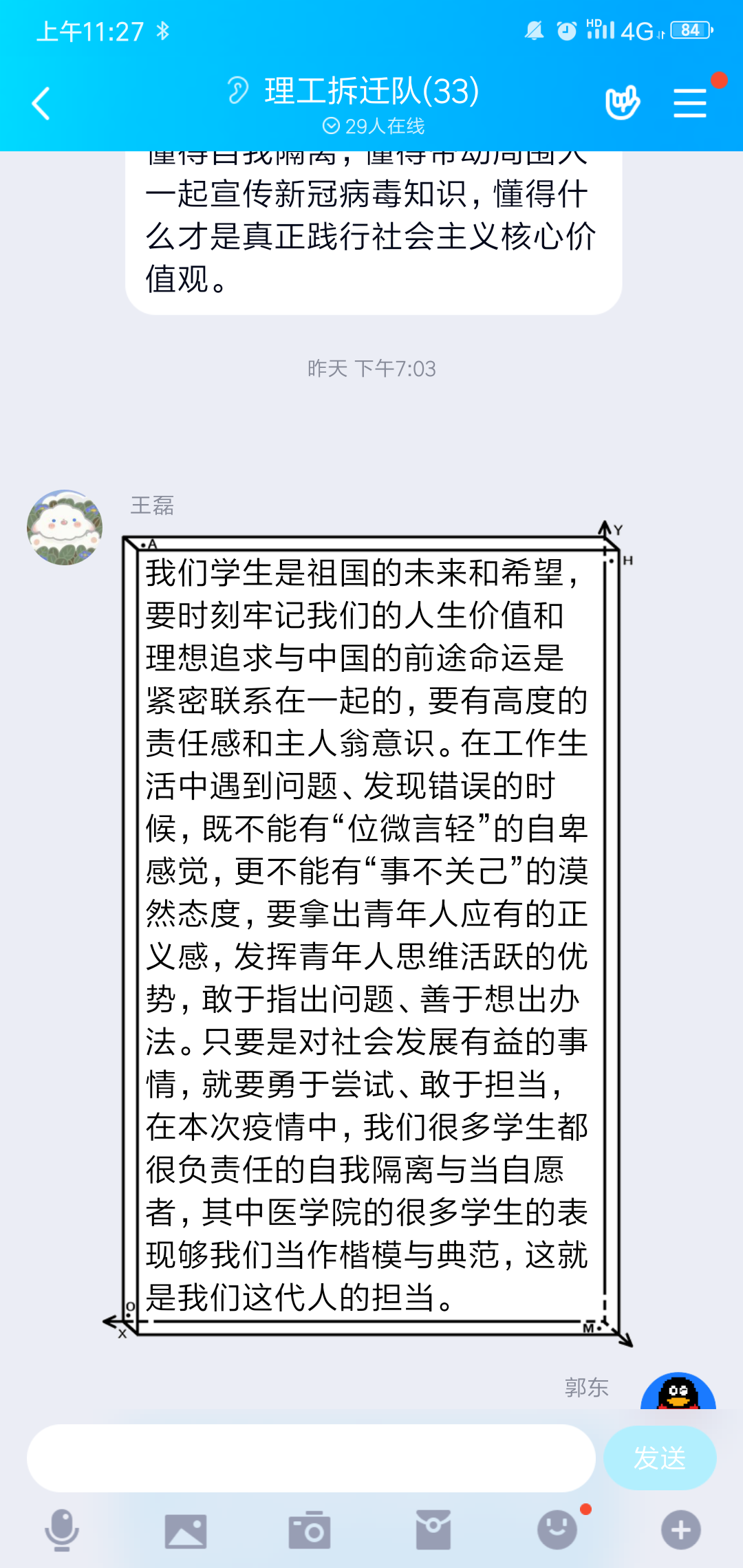 “人生在世虽岗位多有不同,但以敬业之心,做好分内之事,是对岗位、雇主的担当,也是对道德、人格的担当。要知道,敬业才会乐业,有劳才会有得,有工作精进之得,也有工作收入之得,有自食其力的心安之得,也有生活富足的幸福之得。在疫情期间,我们的许许多多广大工作人员,医生、警察、军人、政府工作人员等等,为我们付出了巨大的奉献,我们应该向他们学习,从他们身上学会那份担当与责任。同时我们也发挥出了我们青年该有的担当与责任。” -----------团员何涵说。
