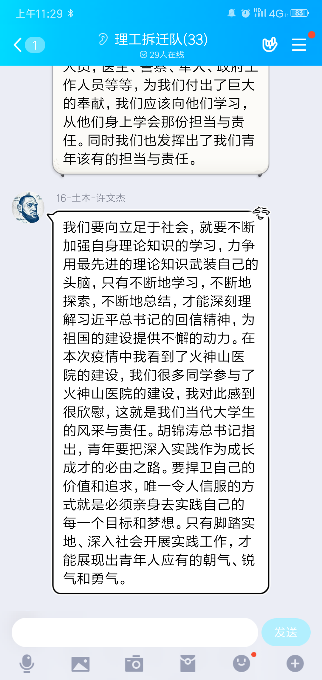 “我们要想立足于社会,就要不断加强自身理论知识的学习,力争用最先进的理论知识武装自己的头脑,只有不断地学习,不断地探索,不断地总结,才能深刻理解习近平总书记的回信精神,为祖国的建设提供不懈的动力。在本次疫情中我看到了火神山医院的建设,我们很多同学参与了火神山医院的建设,我对此感到很欣慰,这就是我们当代大学生的风采与责任。胡锦涛总书记指出,青年要把深入实践作为成长成才的必由之路。要捍卫自己的价值和追求,唯一令人信服的方式就是必须亲身去实践自己的每一个目标和梦想。只有脚踏实地、深入社会开展实践工作,才能展现出青年人应有的朝气、锐气和勇气。”-----------党员许文杰说。