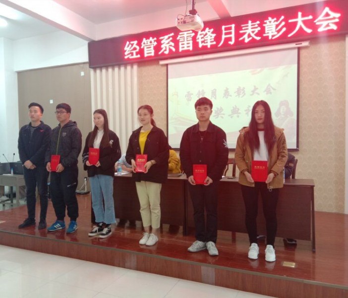 (经管系 张美英)3月28日下午,经管系在一教104报告厅举办雷锋月表彰大会,对活动中涌现出的先进个人及先进班级进行表彰。经济与管理学系党总支副书记王春柳、辅导员老师和学生代表参会。