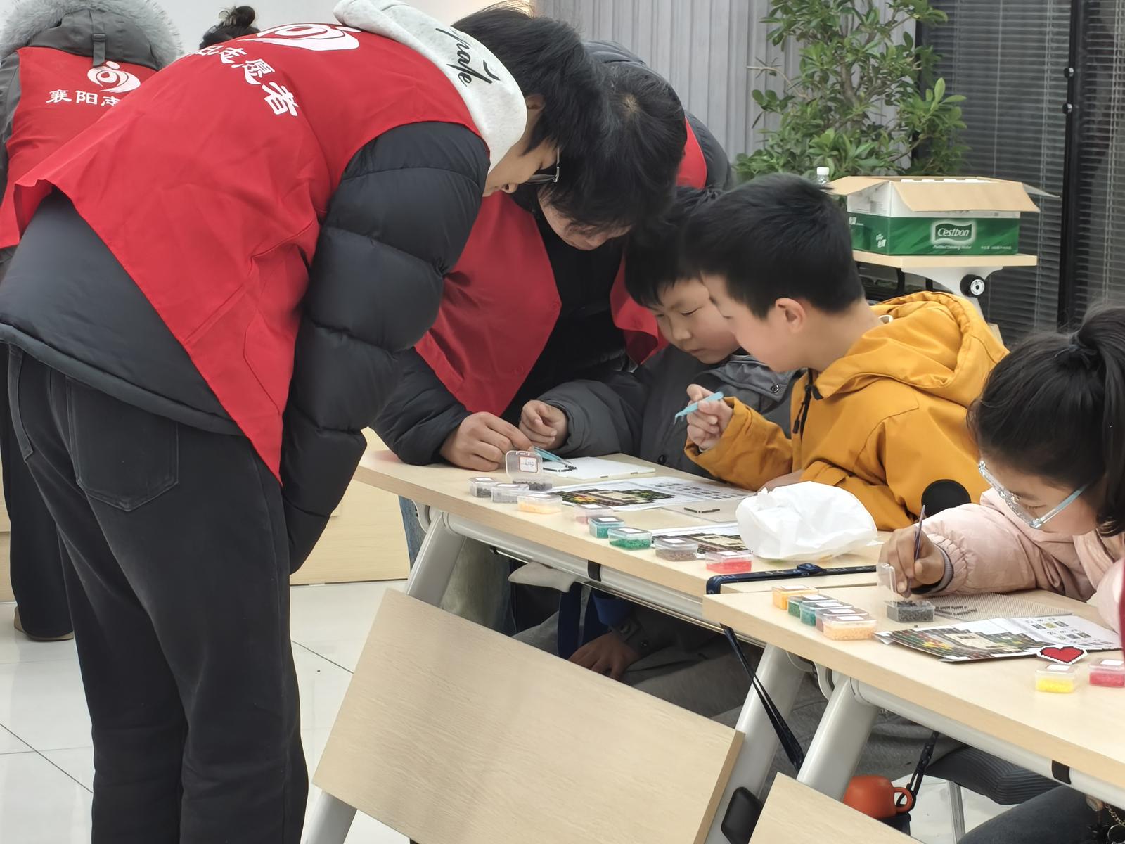 教程演示环节,志愿者们耐心细致地讲解拼豆技巧与安全须知,手把手示范操作方法。手工制作过程中,有的小朋友主动伸出援手,分享自己的拼豆材料,耐心讲解拼搭技巧;有的完成自己的作品后,主动帮助动作稍慢的同学,手把手指导他们摆放拼豆;还有的小朋友主动整理散落的拼豆工具,帮志愿者分担工作,用小小的行动践行着“互助”的雷锋精神。制作完成后,志愿者为孩子们送上雷锋主题小礼品。