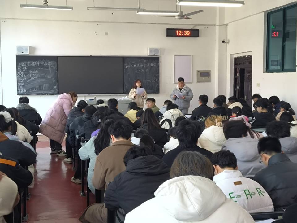 (电信学院 尹小娇)2025年12月18日中午,电信学院于J4-410与J4-415教室分专业召开2026届本科毕业实习动员大会。会议旨在全面部署实习工作,引导学生明确目标、履行职责。学院实验员老师、各专业毕业实习指导教师、毕业班辅导员及全体应届毕业生参会。