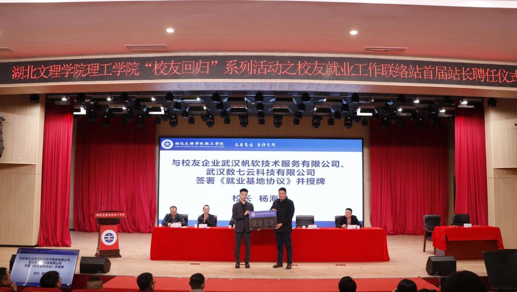 杨海浪与校友企业武汉帆软技术服务有限公司、武汉数七云科技有限公司签署《就业基地协议》并授牌。