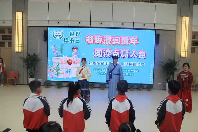 (外语系 王凯)四月的大地新芽吐绿,四月的春风书香馥郁。在这个“最美人间四月天”的季节里,第28个“世界读书日”伴着书墨的芬芳,踏着春的脚步款款而来。4月16日,外语系邀请了来自襄州区朱集镇的十余名留守儿童在学校图书馆一楼大厅举办了以“书香浸润童年,阅读点亮人生”为主题的读书日活动。外语系副主任王娟、党总支副书记骆小青以及辅导员出席活动。