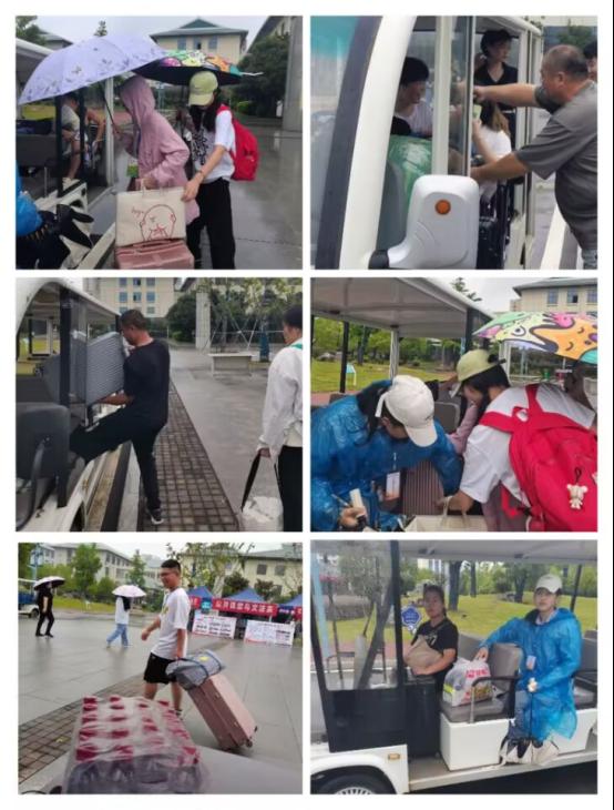 摆渡车来回穿梭,帮助新生拖运行李直达寝室。