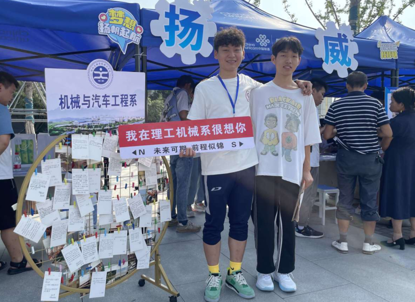“同学你好,请问是机械系新生吗?我带你去机械系报到点!”学校门口,机制2211班志愿者王宇航看见远远走来的新同学,举着系牌欢迎道。