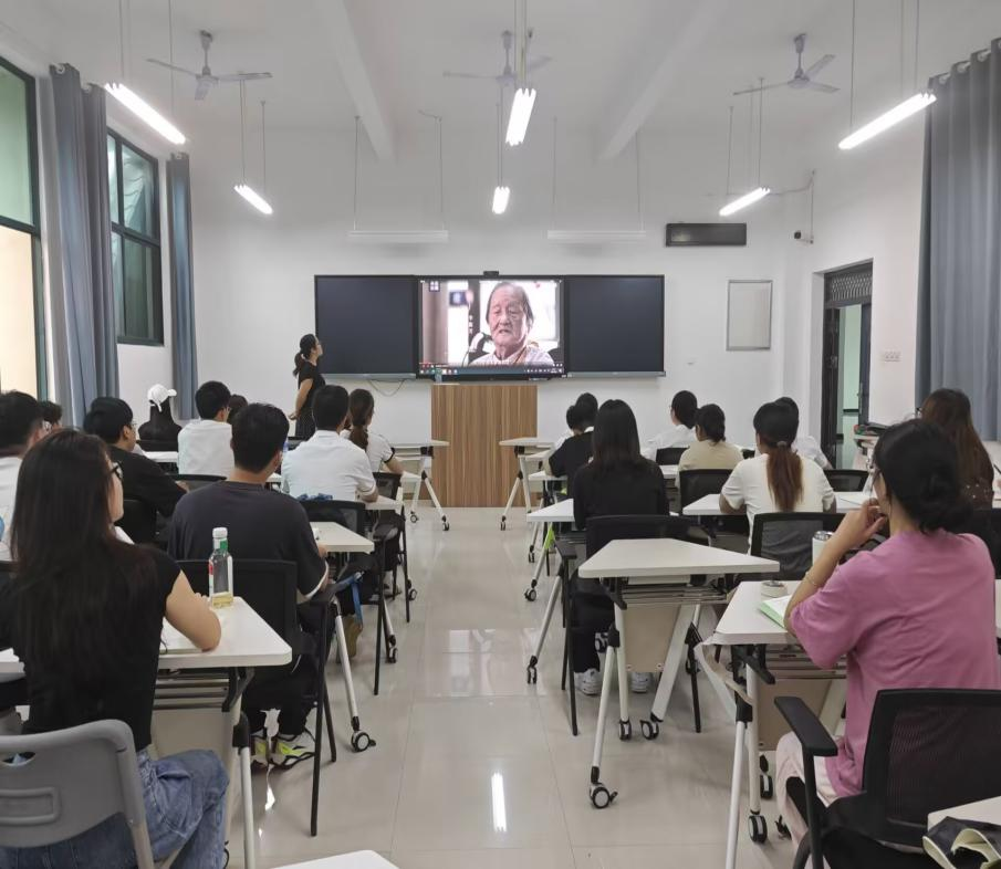 国贸2311班的同学们聚精会神的听着视频中的抗战老兵用颤抖却坚定的声音讲述着烽火岁月中的英雄故事,爱国的星星之火在同学们心中冉冉升起。