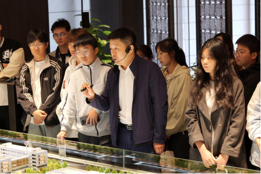 在国投绿城江畔园明庐,这里的现代风格建筑以大面积玻璃幕墙、金属装饰与几何格栅设计为亮点。室内装修精致,符合不同人群风格,师生们在建筑前、房间中驻足观察,结合建筑外观解析了现代建筑的空间布局、光影运用与工程施工要点,用回答问题送礼品的激励机制让新生对现代建筑设计理念与工程实践有了具象认知。