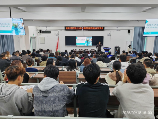 (建工学院 徐雅妮)2025年9月18日下午15点,建筑工程学院联合湖北工业建筑学校在1教105教室成功举办了“七大员&技能等级鉴定”宣讲直通车活动。此次活动旨在为建筑工程专业专升本新生提供全方位的考证指导与职业规划建议,帮助他们更好地适应行业需求,为未来的职业发展奠定坚实基础。