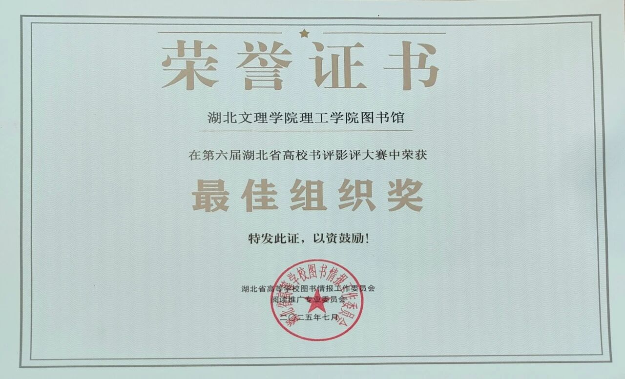 近日,由湖北省高等学校图书情报工作委员会阅读推广专业委员会主办、武汉大学图书馆承办的第六届湖北省高校书评影评大赛评选结果正式揭晓。我校图书馆凭借高效的统筹协调与扎实的组织工作,荣获大赛“最佳组织奖”。
