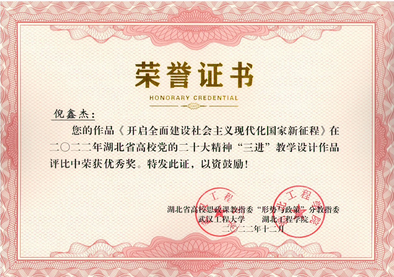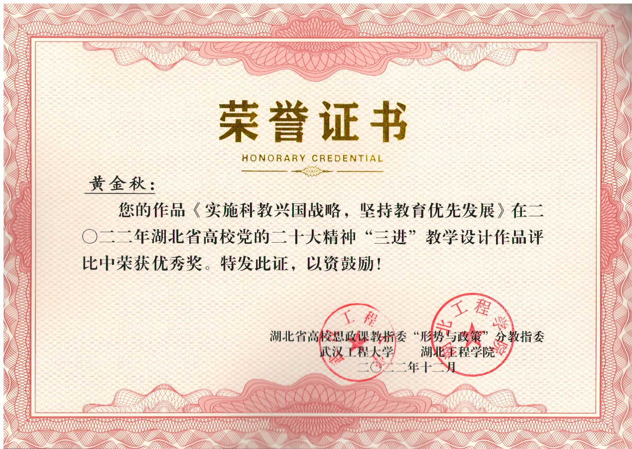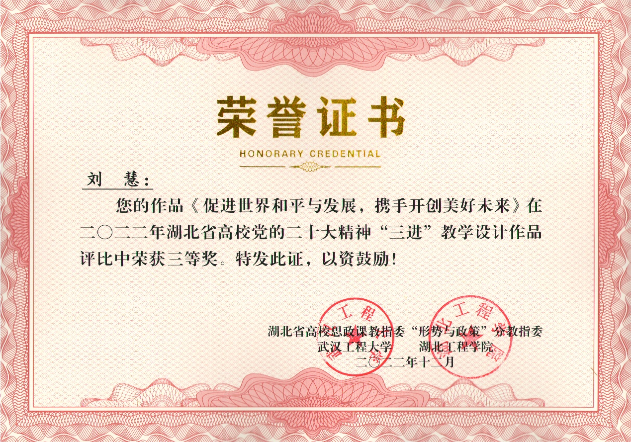 (文法系 谢婉雯)近日,在由湖北省高校思想政治理论课教指委“形势与政策”分教指委主办,省内共44所本专科院校84名思政课教师同台竞技的比赛,关于党的二十大精神“三进”教学设计作品评比中,我院刘慧老师的作品《促进世界和平与发展,携手开创美好未来》荣获大赛三等奖,黄金秋老师和倪鑫杰老师的作品《实施科教兴国战略,坚持教育优先发展》、《开启全面建设社会主义现代化国家新征程》均获得优秀奖。
