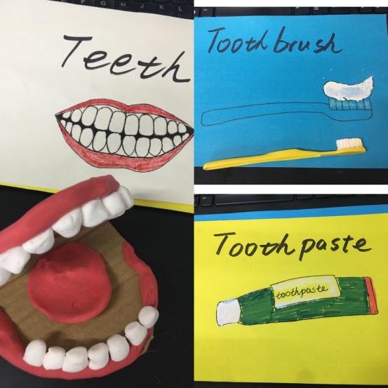 因我校学生处于静默管理期,外语系特派出学前教育专业《幼儿英语教学法》课程负责人王婷婷老师入园开展本次活动。首先,王老师用Walking-walking带领小朋友们集体热身活跃气氛,然后用饼干手指操自然导入今天的爱牙主题——“护牙健齿少年强,健康中国民族兴”,提醒小朋友们饼干太甜吃多了牙疼(捂脸),呼吁小朋友们不要“哎呀”(捂脸)而要爱牙。随后,她逐一向小朋友们展示自制卡片toothbrush、toothpaste和teeth(邀请出护牙小卫士——牙膏、牙刷一起来护牙)。期间,王老师又分别采用拍卡片、大小声、PK跳圈圈等小游戏进行了领读、重复和指认。接着,又拿出牙膏、牙刷和牙齿的实物道具,再次跟读强化这三个英文单词。通过“找朋友”的小游戏,让小朋友们把卡片和实物逐一对应起来,进一步巩固所学。最后是拓展环节,带领幼儿用彩泥捏制专属小牙刷,再用一首刷牙歌引导小朋友们打开正确的刷牙方式:Brush your teeth,up and down,round and round,from left to right.