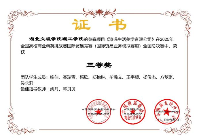 (教育学院 杨梦璐)在刚刚落幕的2025年全国高校商业精英挑战赛国际贸易竞赛(国际贸易业务模拟赛道)全国总决赛中,教育学院英语专业2022级本科生方梦琪同学凭借扎实的专业素养和出色的实战能力,斩获全国三等奖的优异成绩!这一荣誉不仅是对她个人能力的肯定,也为学院赢得了荣誉。