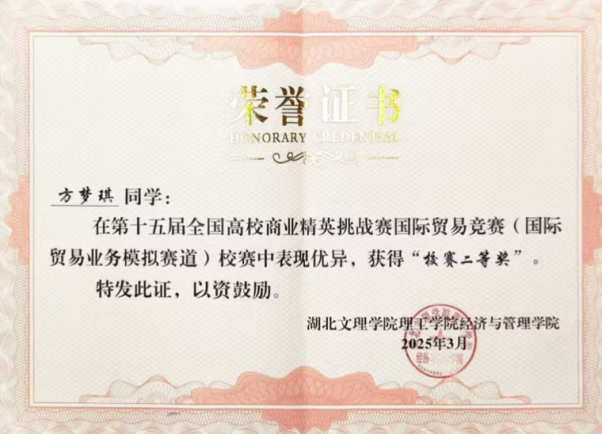 此次竞赛汇聚了全国各高校的顶尖选手,竞争异常激烈。方梦琪同学凭借流利的商务英语表达、敏锐的市场分析能力以及出色的团队协作精神,在模拟国际贸易谈判、业务策划等环节中表现亮眼,赢得了评委的一致认可。