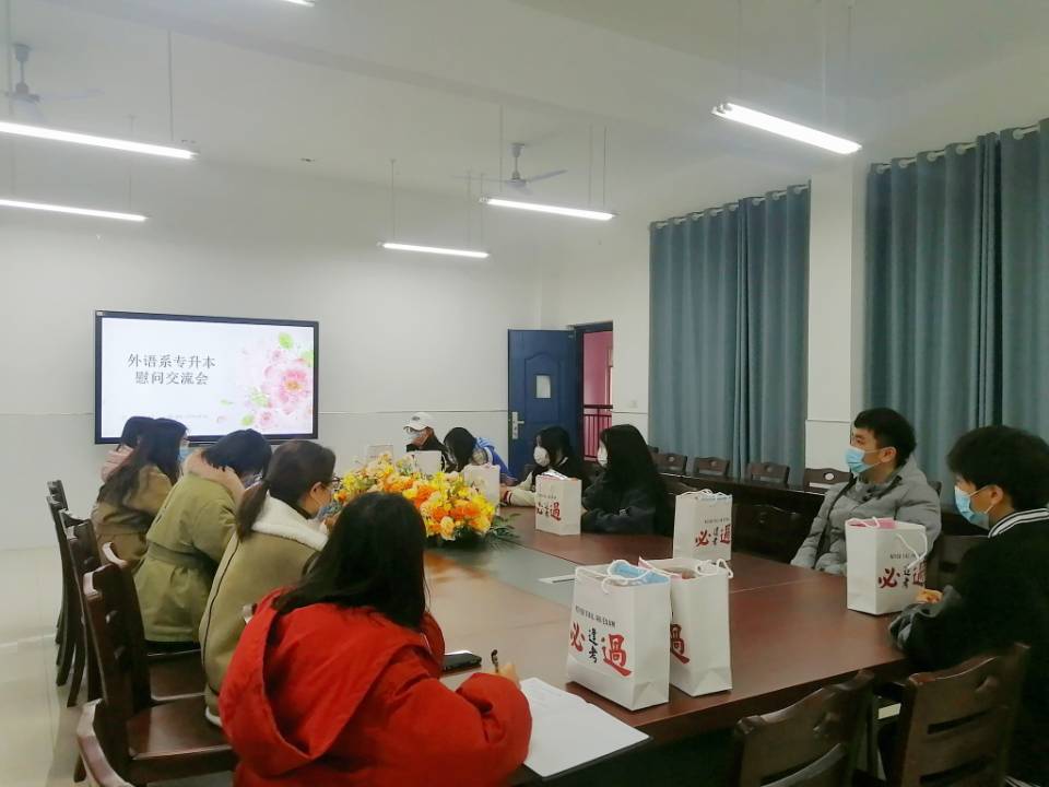 (通讯员张高芬)3月19日,为了鼓舞专升本学子的士气和斗志,表达学校对他们的关心和关爱,外语系党总支开展以“助力专升本,师生心连心”为主题的慰问交流会。联系外语系党政领导、教工支委成员、辅导员出席座谈会。