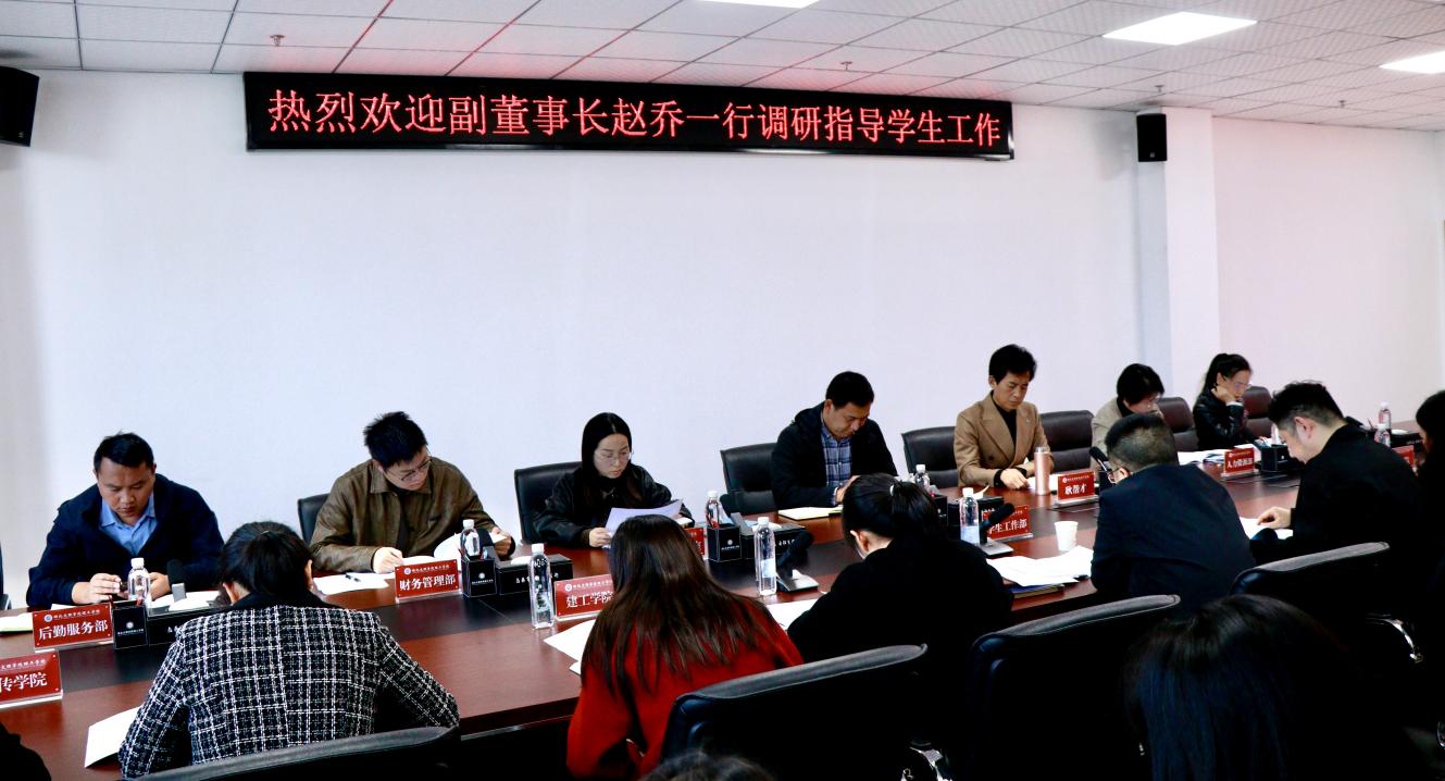 (通讯员 曹淑娟 贾子旭)为深入了解学生工作部当前运行状况,研讨存在问题与发展瓶颈,明确未来发展方向,推动学生工作提质增效, 11月5日下午,学校副董事长赵乔在图书馆722会议对2025年学生工作部工作进行调研。学校副校长耿帮才,学校办公室、人力资源部、财务管理部、资产管理部、后勤服务部负责人出席会议,二级学院党总支书记代表、分团委书记代表及辅导员代表、学生工作部全体工作人员参会。 会议由学生工作部部长、团委书记宋功成主持。