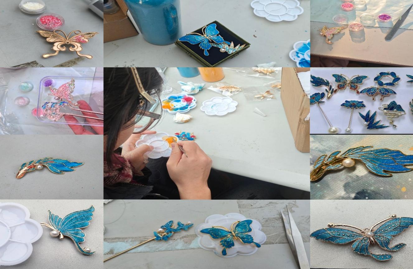 本次活动特设螺钿艺术工坊、景泰蓝创意空间两大体验区。螺钿工坊备齐彩贝钿片、金属簪底,社团专业人员展示裁剪、打磨、嵌制技艺,指导师生雕琢专属螺钿发簪;景泰蓝创意空间内,环保珐琅彩砂与掐丝基底一应俱全,彩砂调配、填色留白巧思,助力师生打造雅致精美的景泰蓝发饰。