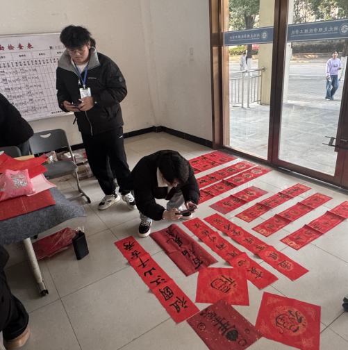 在书画协会同学的“手把手”指导下,许多第一次握毛笔的同学从生涩到流畅,完成了属于自己的第一幅春联作品。红纸黑字间,或许笔法尚且稚嫩,但每一笔都饱含真诚与热情。