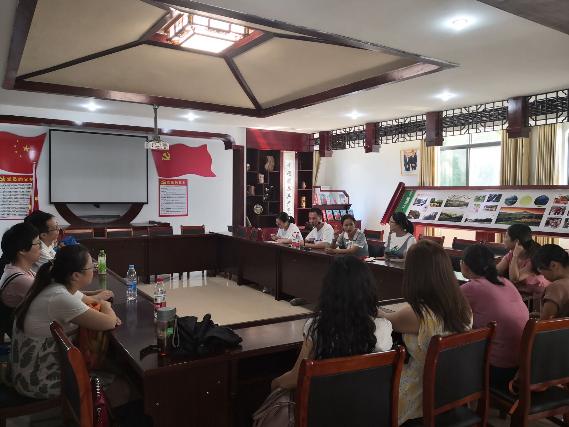 经管系14名教师党员到达堰河村村委会后,参观了堰河村村史博物馆,观看了堰河村宣传记录片。堰河村在村支书闵洪艳带领下,抓住改革发展机遇,生态文明建设取得了巨大成功,昔日贫穷的堰河村现已建设成为全国闻名的生态旅游村,