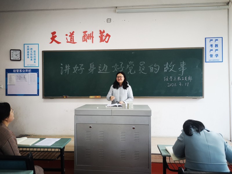 (经管系 钟会荟)3月11日下午,经管系教工支部在J4-315开展了三月份主题党日活动,全体教师党员参加。本月的X活动是讲好身边好党员的故事。