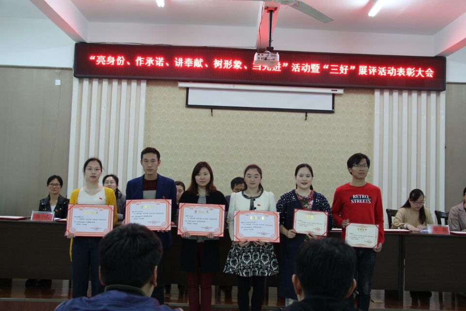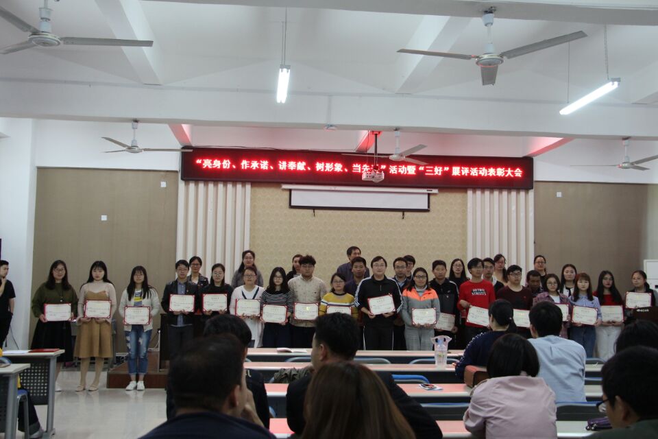 4月17日中午,学校在一教104报告厅召开“亮身份、作承诺、讲奉献、树形象、当先进”活动暨“三好”展评活动表彰大会。党委书记刘先和、各党总支副书记和党员代表参会。会议由院长助理、党群工作部部长贾娴雅主持。