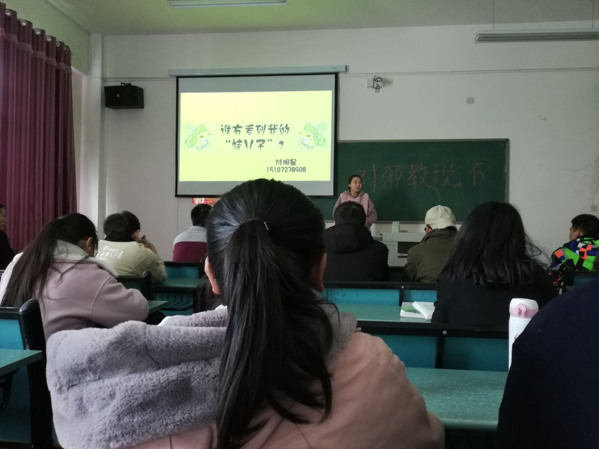 活动中,建筑工程系付明星书记给同学们讲解了邪教组织给人们带来的各种危害——迫害家庭的美满幸福,危及社会安定和谐等。同时,她邀请同学们一起加入反邪教的队伍,举起反邪卡片,一起对邪教说不 。