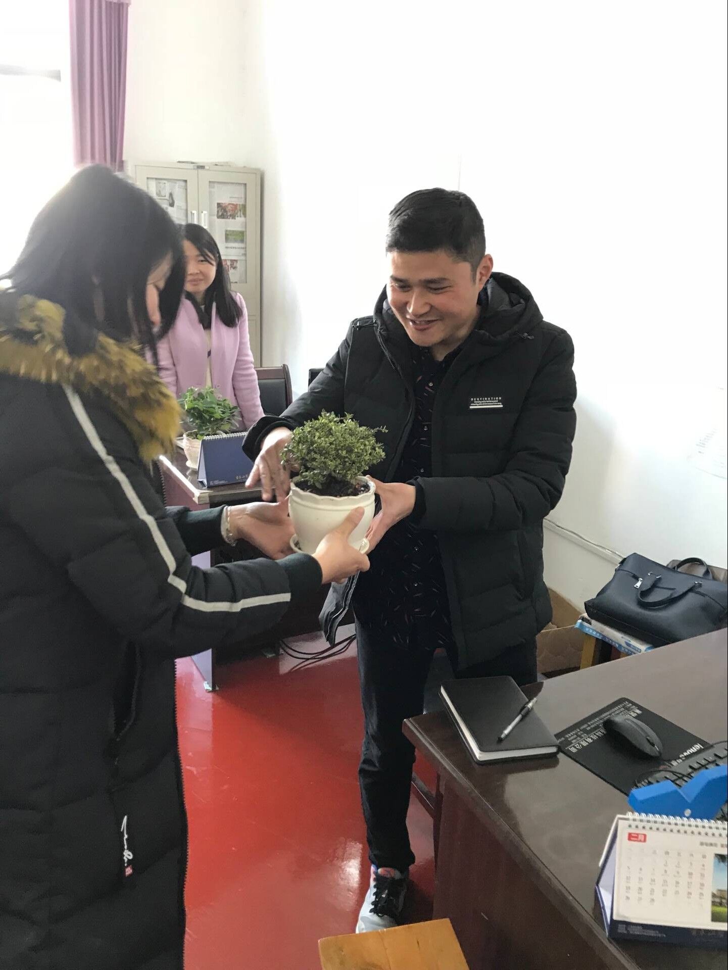 学生党员还贴心地送上了精心准备的绿色盆栽植物,希望老师们能在繁忙的工作期间拥有好心情。