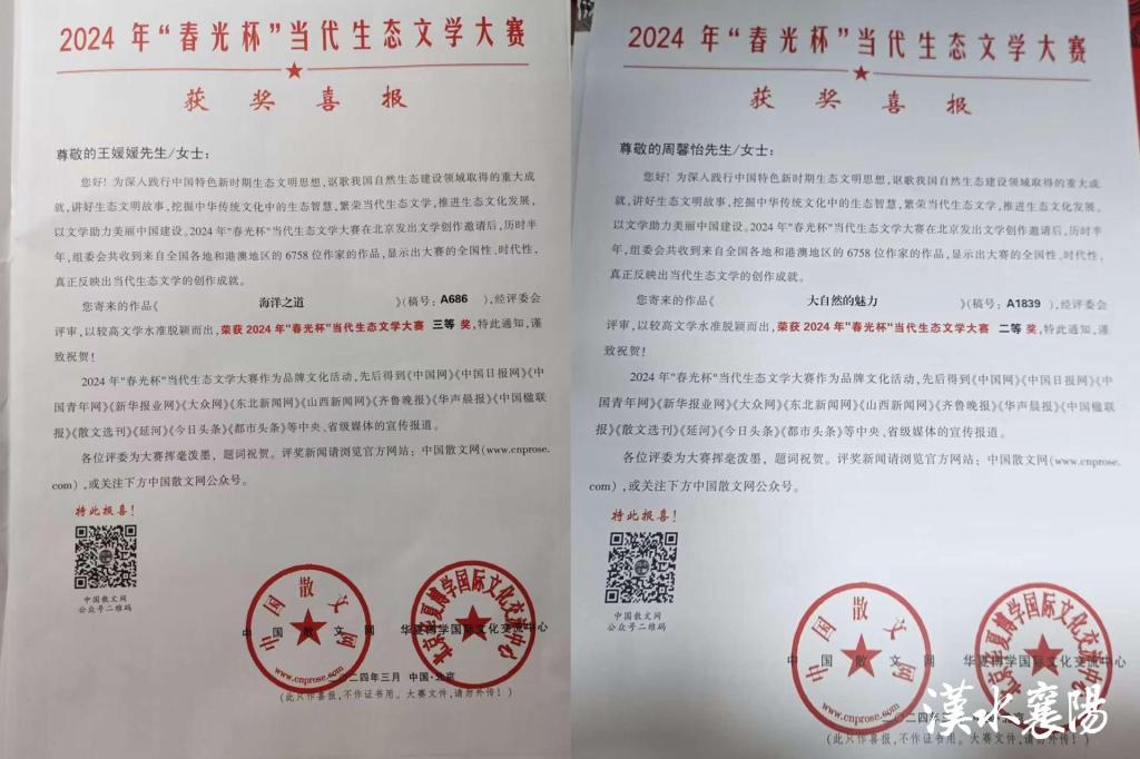 3月29日,2024年“春光杯”当代生态文学大赛获奖作品揭晓,湖北文理学院理工学院汉语言文学专业周馨怡同学创作的《大自然的魅力》,王媛媛同学创作的《海洋之道》分别荣获全国二等奖、三等奖。