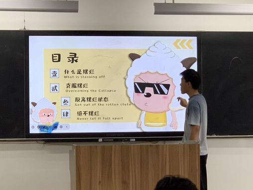 活动在激昂的开场白与励志短片中拉开序幕。主持人龙齐阳通过PPT展示与同学分享,大家深入认识了“摆烂”在学业与生活中的具体表现。随后,各小组围绕其成因展开热烈讨论,并派代表发言,共同剖析了目标缺失、压力调节不当、自我管理薄弱等深层原因。