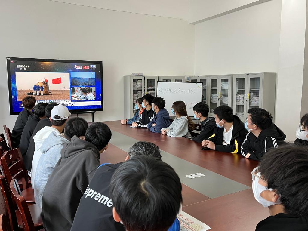 为迎接英雄回家,电信系组织在会议室直播共享,开展了一场特殊的欢迎仪式,在场的同学们内心充满对三位英雄宇航员归来的期待,在他们成功出舱后,大家难以平复激动的心情,掌声与赞叹声不断,这是对宇航员的赞美,也是对祖国强大、科技繁荣的自豪。