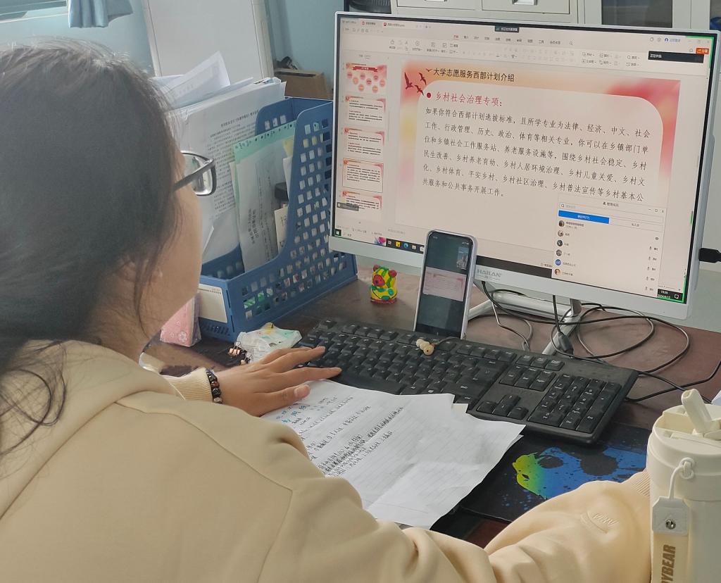 (电信学院 王琳琳)青年当有志,立志为四方。为进一步做好2024年西部计划的宣传动员工作,增进同学们对西部计划的理解,引领新时代青年到西部去、到祖国需要的地方建功立业。4月10-15日,电信学院开展2024年大学生志愿服务西部计划宣讲会,宣讲会以班级为单位,由各毕业班辅导员采用线上形式进行。