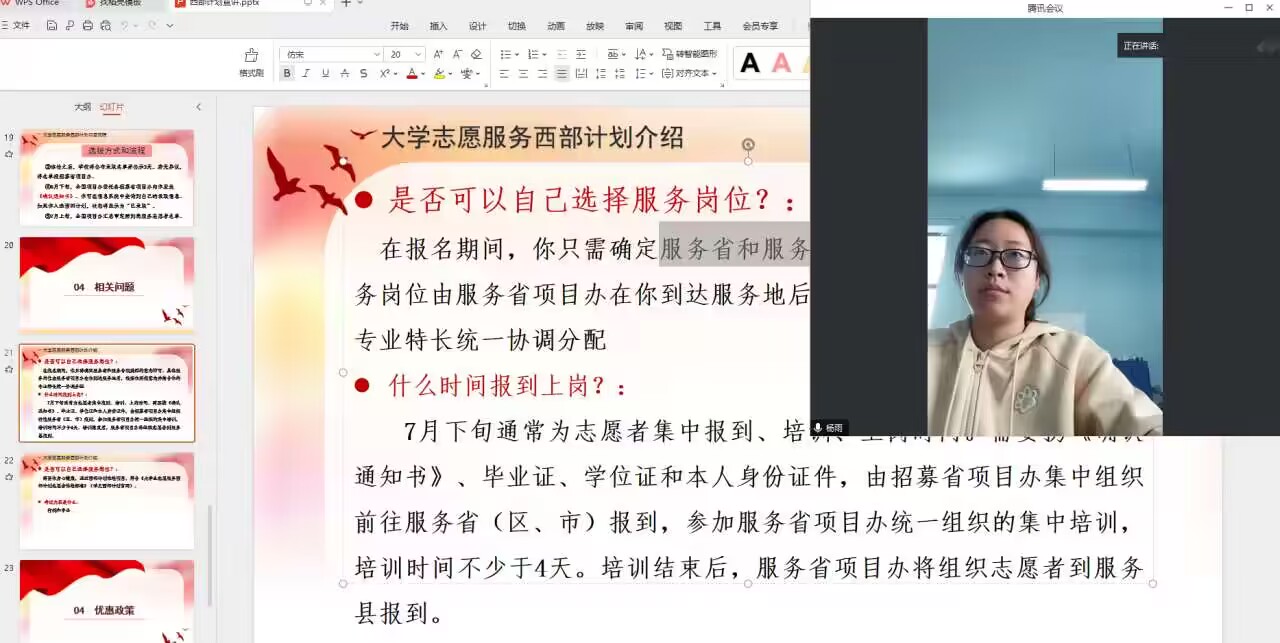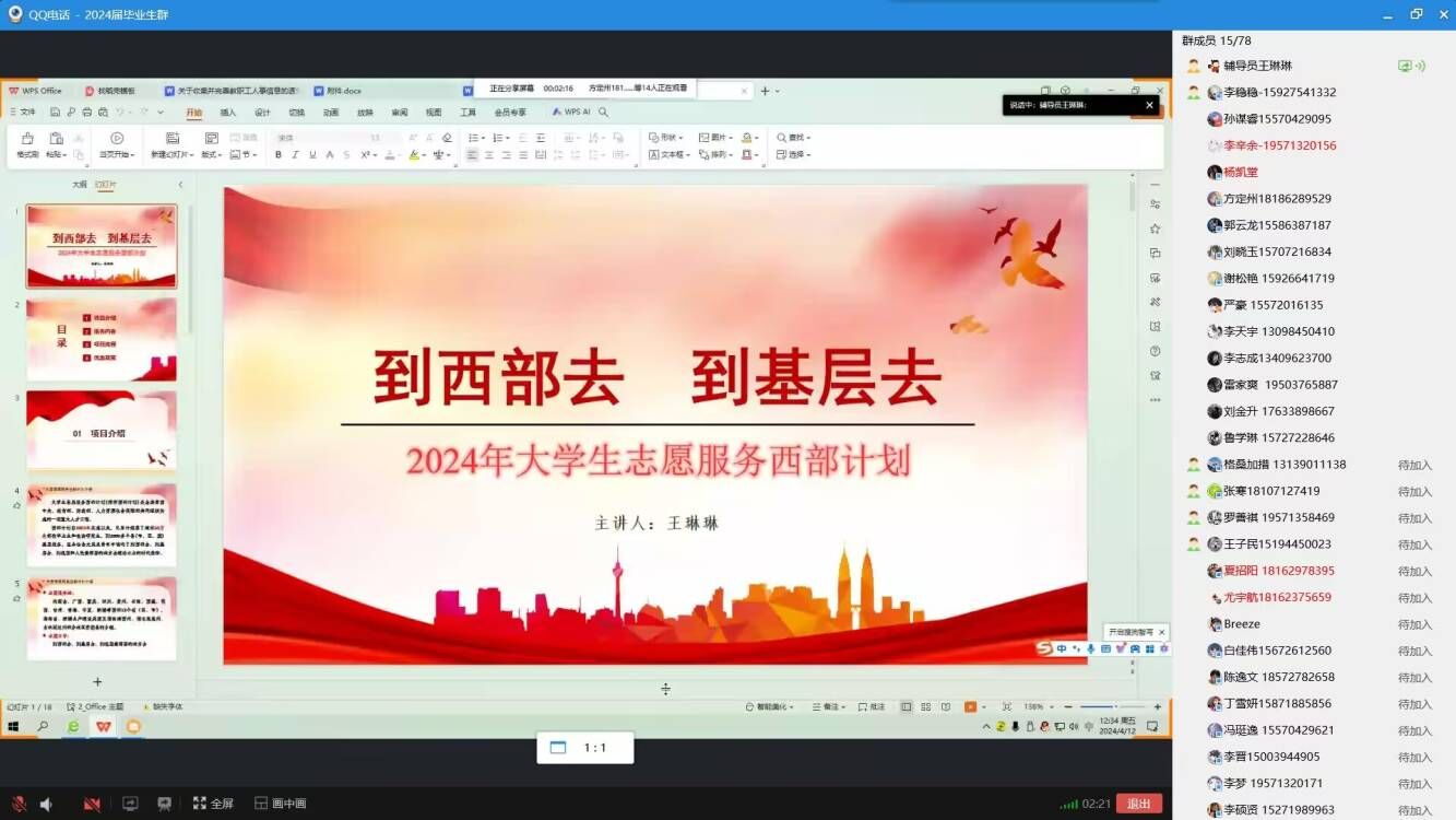 会上,各毕业班辅导员针对2024年西部计划政策进行宣讲,从项目简介、服务内容、招募流程、政策保障等多方面进行解读。通过播放宣讲视频,讲述往届志愿者们热血青春任担当的成长故事,激励电信学子践行时代使命,走进基层、走进乡村,到西部地区挥洒青春做出贡献!同时,为参会的毕业生们现场答疑,对大家所关心的政策、待遇、服务期满后续发展等问题,进行了耐心解答,并提醒同学们在笔试、面试中需要注意的问题。