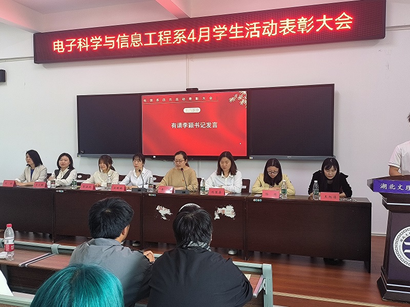 大会首先由分团委书记王琳琳老师宣读《关于湖北文理学院理工学院电子科学与信息工程系四月学生活动表彰决定》。王琳琳老师希望受表彰的同学和集体再接再厉,不断取得新成绩,继续发扬无私奉献,团结友爱的精神。希望全体同学以先进为榜样,在奉献青春,服务群众的志愿实践中成人成才,为我系教育教学以及各项工作再上新台阶贡献力量。