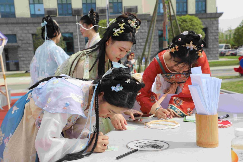 此环节书画艺术协会的成员现场开展了书法表演和书法教学,从笔法的由来、五指握笔的方式,到讲述书法大家的史迹。伴着微风中阵阵淡雅墨香,同学们逐渐感悟到“字如其人”的深意,学书法亦如学做人,要心存正念,满怀家国之情。