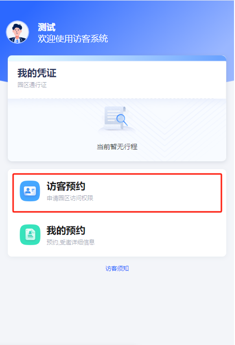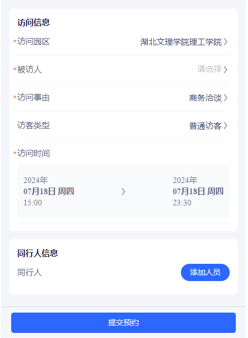 5.填写访问院区、被访人、访问事由和访客类型;选择访问时间;添加同行人信息。