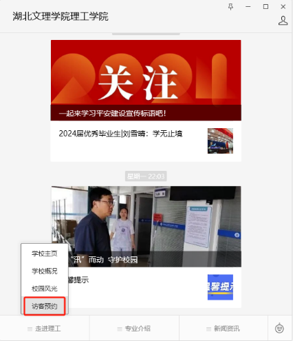 1.关注湖北文理学院理工学院公众号,点击 走进理工-访客预约。