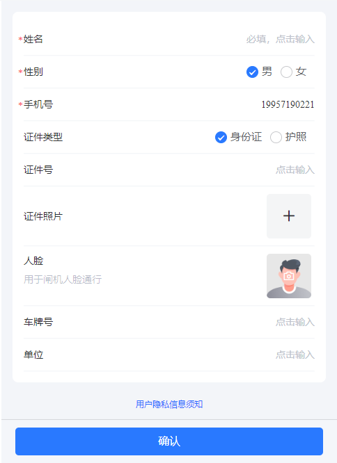 3.填写姓名、性别、手机号、证件类型、证件号;上传证件照片,人脸;填写车牌号,单位。