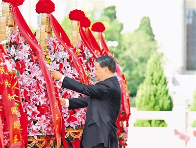 9月30日上午,党和国家领导人习近平、李强、赵乐际、王沪宁、蔡奇、丁薛祥、李希、韩正等来到北京天安门广场,出席烈士纪念日向人民英雄敬献花篮仪式。这是习近平整理花篮上的缎带。 |