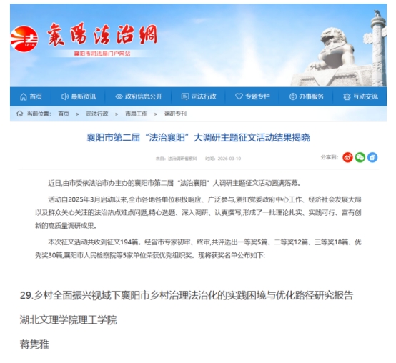 (经管学院 马比双)近日,襄阳市第二届“法治襄阳”大调研主题征文活动结果正式揭晓,我校蒋隽雅老师的《乡村全面振兴视域下襄阳市乡村治理法治化的实践困境与优化路径研究报告》凭借扎实的调研分析、贴合本土发展的实践价值,荣获本次征文活动三等奖。