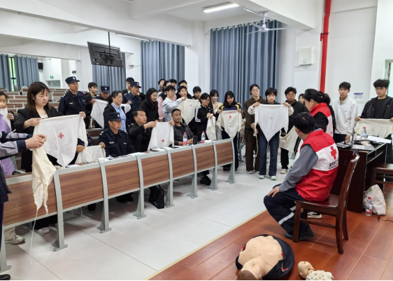 实操环节,张文军借助人体模型、AED训练机、三角巾、绷带等专业教具,逐一讲解示范标准操作步骤。现场气氛热烈专注。牛攀山率先垂范,参与实操练习,全体人员分组轮流上阵,认真观摩、反复演练,从胸外按压深度频率、气道开放手法,到AED电极片粘贴、伤口包扎技巧,逐一攻克难点,切实提升动手施救能力,现场学习氛围浓厚、实操效果扎实。培训尾声,全体人员进行理论笔试与实操技能双考核,全面检验学习成果,为校园应急处置储备专业力量。