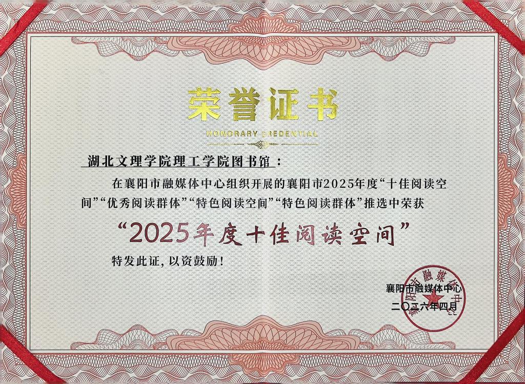 此次荣获“2025年度十佳阅读空间”称号,是对我校图书馆建设与阅读推广工作的充分肯定。图书馆将持续优化阅读环境、提升服务质量,丰富校园阅读活动,让书香浸润校园,助力襄阳全民阅读深入开展。