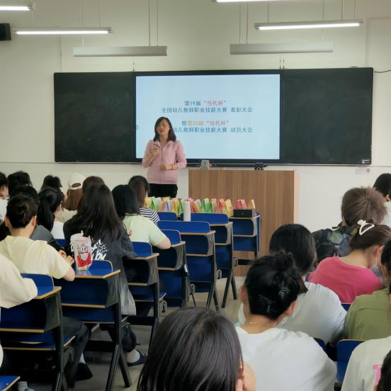 外语系副主任王婷婷做赛前动员。她号召学前教育学生积极参加比赛,并对十九届“当代杯”大赛获奖学生表达了肯定。她希望同学们借此机会,以赛促学、发挥特长,提升技能。她指出,外语系将组织专业导师团队给予参赛学生强大的技术支撑和“一对一”指导。